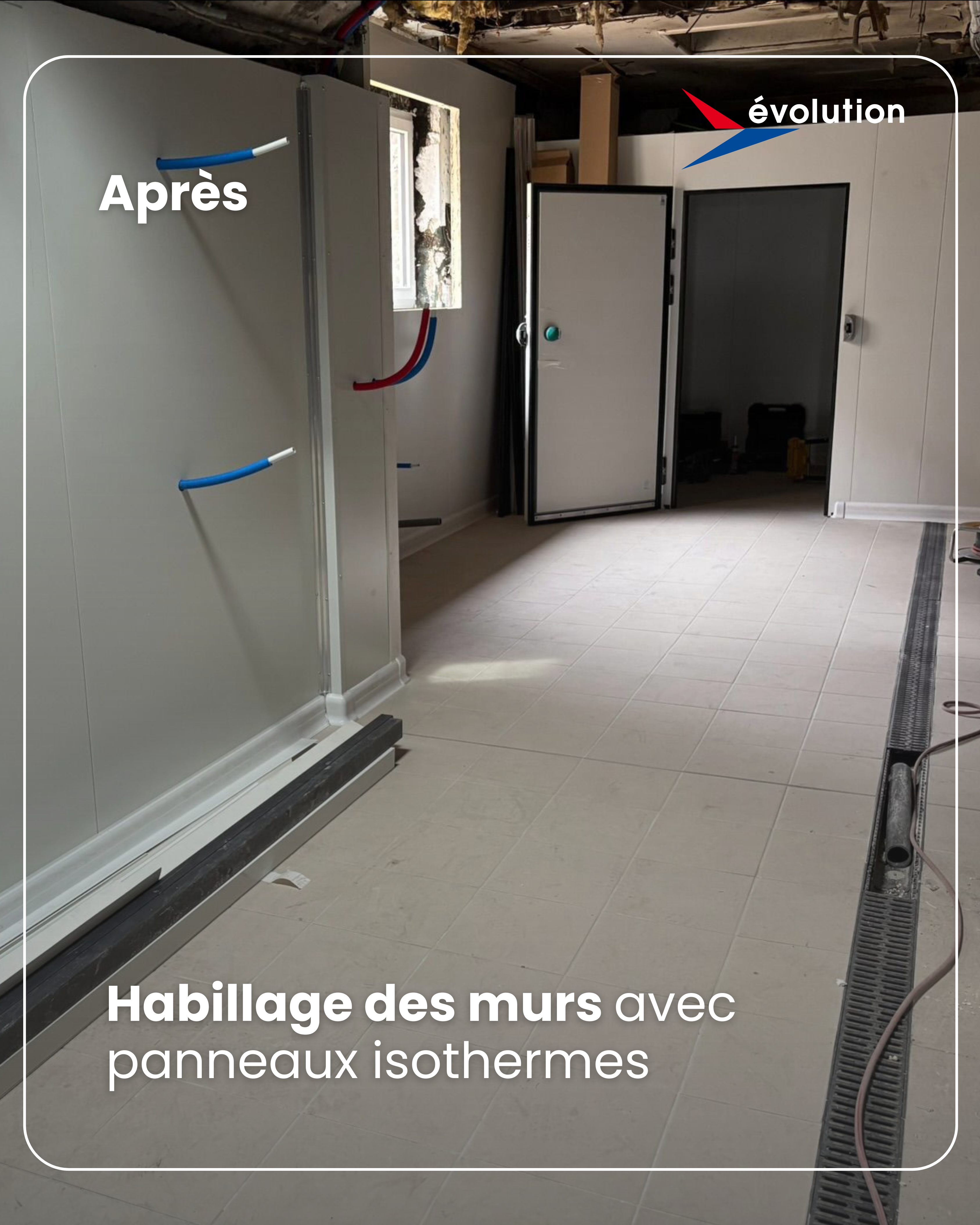 - Habillage des murs en panneaux isothermes pour une isolation parfaite et une hygiène renforcée.